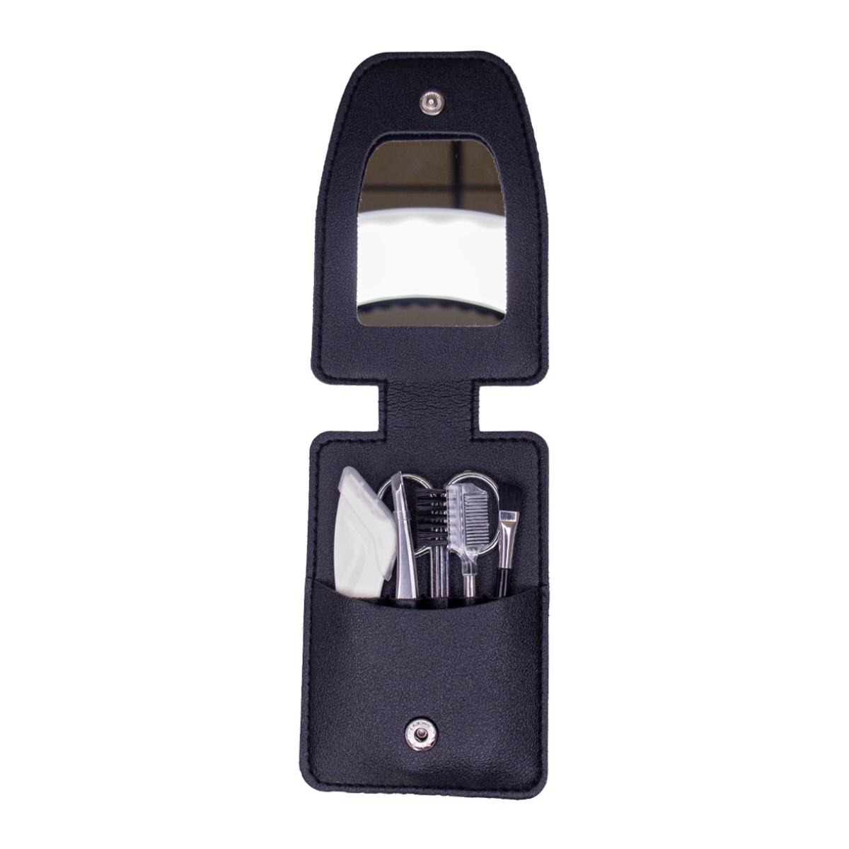 Case (Estojo): Confeccionado em PVC texturizado preto, elegante e resistente, com fechamento por botão de pressão e espelho acoplado.