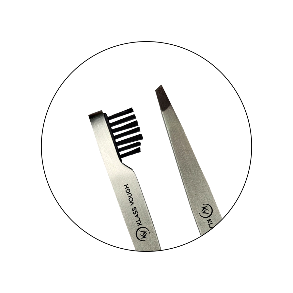 Diferente das pinças convencionais, esta Pinça apresenta um corpo híbrido. Enquanto uma extremidade foca na extração precisa, a outra oferece um pente acoplado que facilita a visualização do design em tempo real, permitindo pentear os fios para identificar falhas ou excessos antes da remoção.